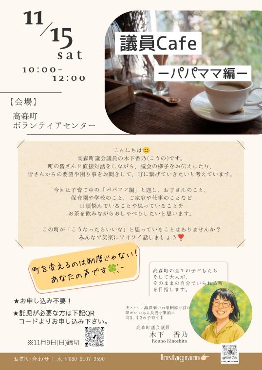 高森町議会議員の木下香乃(きのしたこうの)さんが、子育て世代の方と直接話して、もっと住みやすい高森町にしていくために開いてくれた今回の議員cafe