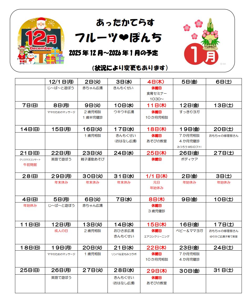 12月~1月のフルーツ♥ぽんちの予定表をお届けします