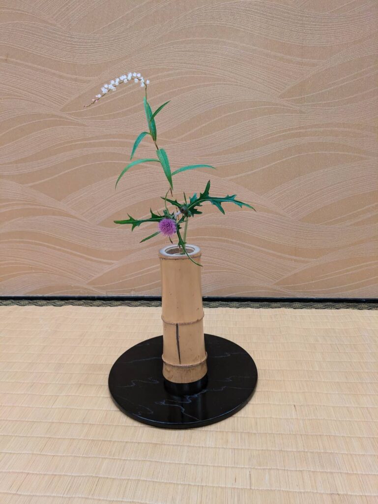 お茶会を催す時は床の間に、その席のテーマとなる掛軸をかけ、季節の花と共にお客様をお迎えします。上の写真には、長板の上に炭をおこしお湯を沸かす道具である、風炉釜と水をいれる容器の水指が置かれています。こちらは昨年2025年9月に松本のブエナビスタで長野県支部発足70周年記念行事の茶会があり、その本席の設えです。お釜は中々ユニークな形ですが、【座瓢釜…ざひょうがま】(…瓢が座っているような…)と言って釜師の大西家初代の、大西浄林(1664年没)の作で、水指も時代を経た染付です。下の写真のお花はその席のお花です。サクラタデとアザミを竹の花入に入れてあります。この花入れは裏千家9代、不見斎宗匠作(1800年に56歳で亡くなられた…)の竹花入です。(ちなみに裏千家当代は16代、坐忘斎家元です)