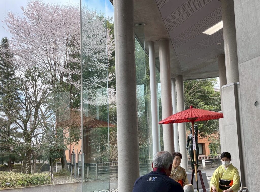 裏千家南信分会の茶会は、毎年“新年、春、秋”の3回行われています。その3回の茶会の間に、昨年6月には【和(なごみ)の茶会】と言う、とにかくお茶を身近に楽しんで頂きたいと言う思いで、2席で茶券代2000円にて行われた茶会もあったり、飯田下伊那にあります、表千家、裏千家、大日本茶道学会の三流派が飯田美術博物館において、桜の季節に毎年順番に担当して行われる桜茶会が、昨年2025年4月には裏千家の担当で行われました。😊外は桜が見頃で…でも何となく降りそうな気配だったので飯田美術博物館の館内にて、外からもガラス越しに見える位置に席を設けて行いました。 ↓下の写真が桜茶会の一コマですが、赤い野点傘を立て、その傘の軸に、この茶席のテーマとなる短冊をかけ、花を生けて、こちらは立礼席の設えで、お客様も椅子にお座り頂き、お菓子とお茶を、お点前を見ながら楽しんで頂きました。桜も見頃で、桜見物がてらのお客様が大勢お越しくださった為、この茶会用にと手配したお菓子が早々に無くなってしまい、追加したのですが又無くなると言う盛況ぶりでした。
