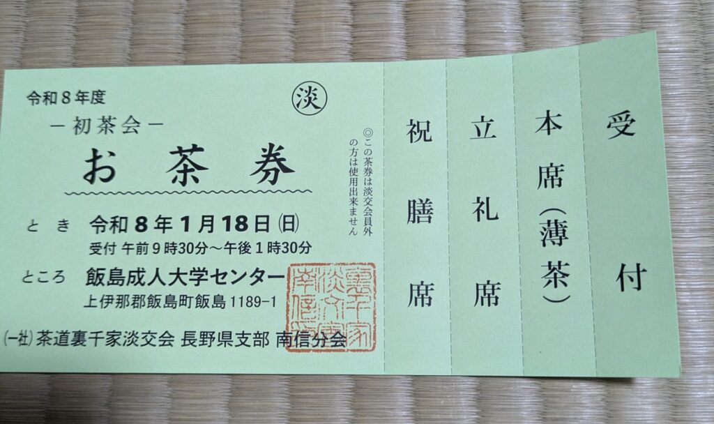 その中の【裏千家、長野県支部南信分会の初茶会】が2026年 1月18日の日曜日に飯島町の成人大学センター(飯島町飯島1189-1)にて行われます。(受付は9時半から13時半です)