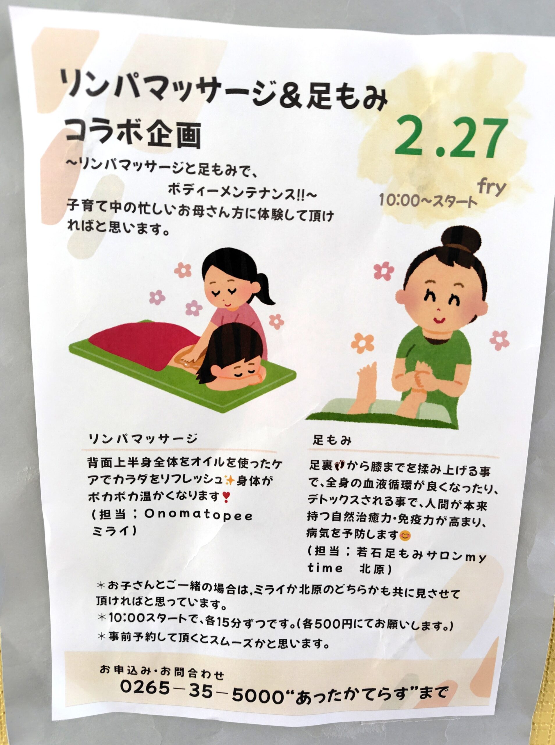 お母さん向けには、毎回好評のマッサージと足もみ講座が嬉しいコラボ企画を開催します。2/27(金)と3/25(水)、ぜひあったかてらすへお越しください。