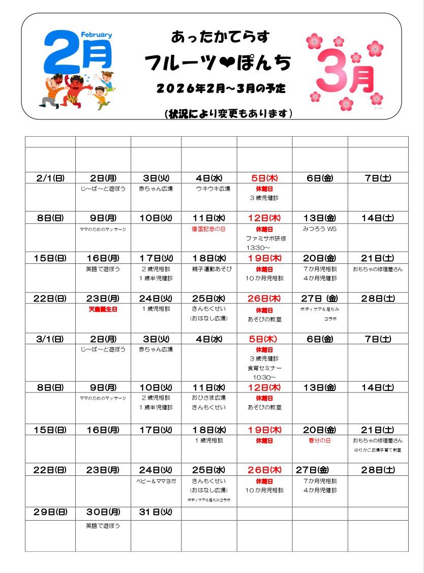 2月~3月のフルーツ♥ぽんちの予定表をお届けします
