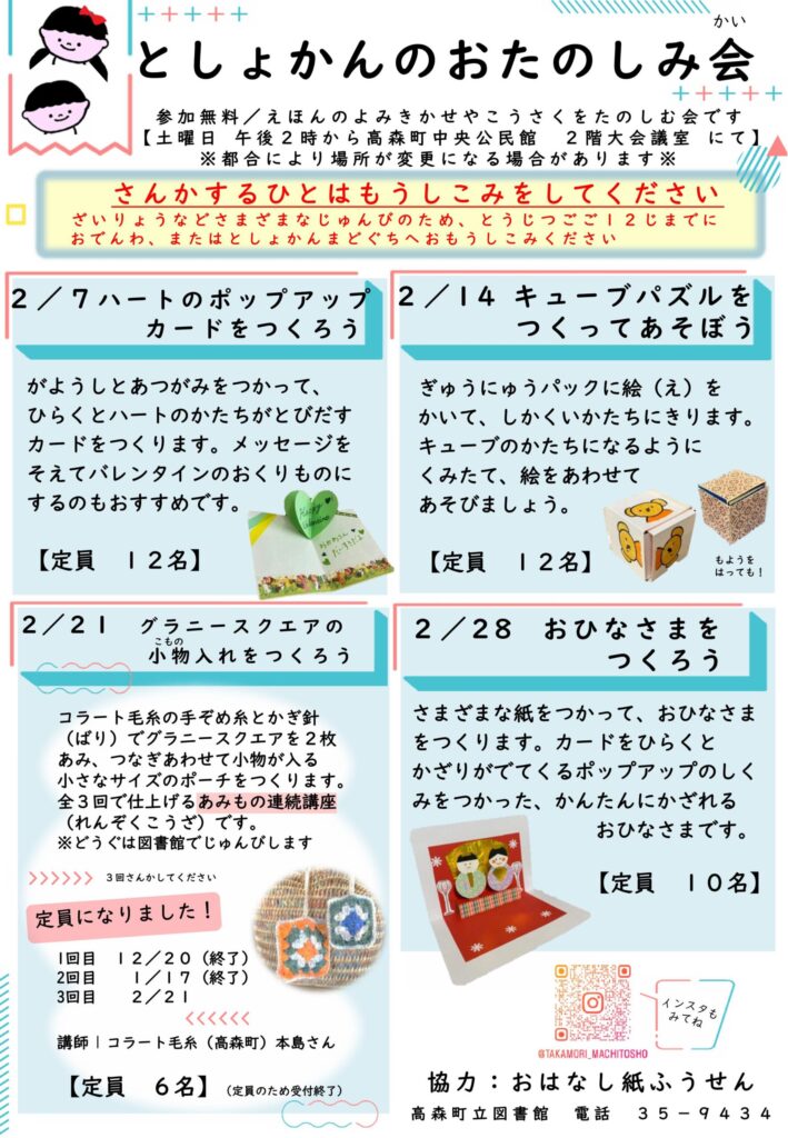 「としょかんのおたのしみ会」のお知らせ 2026年2月-長野県高森町立図書館