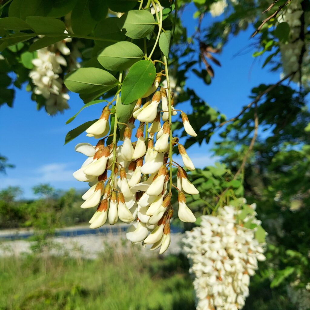 この白い花がニセアカシア。強く甘い香りが特徴です。丈夫なので街路樹としてもよく使われていて、国道脇などにも植えられています。