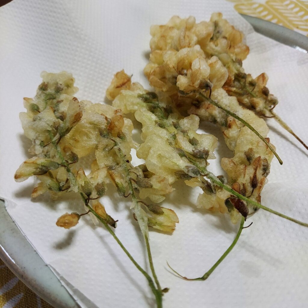ではここで本題。このニセアカシア、お花を食べられるんです。天ぷらにしたり、ホットケーキに混ぜたり、サラダや甘酢漬けにしたりと、食べ方はさまざま。口にすると、甘い香りが広がります。